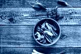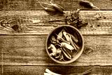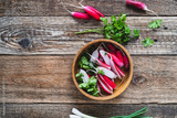 Long breakfast sliced radishes and fresh springtime herbs on wood board