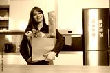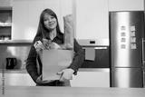 Portrait of beautiful young woman with grocery in paper shopping bag at home kitchen