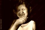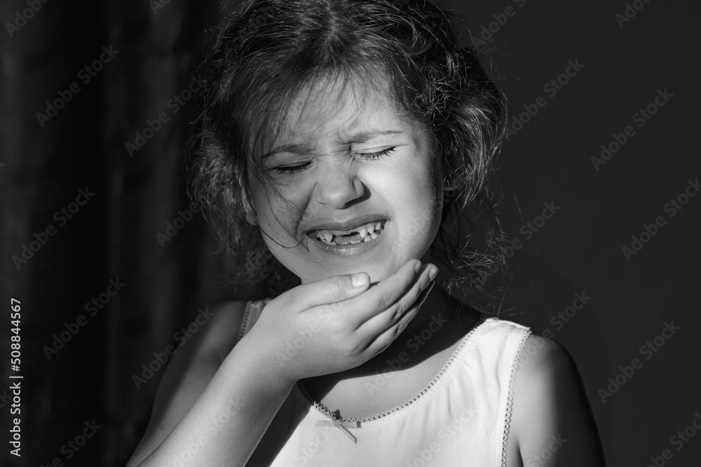 A small child girl is sick and covers her mouth with her hand, coughing and vomiting, feeling unwell, pale, indoors