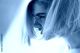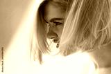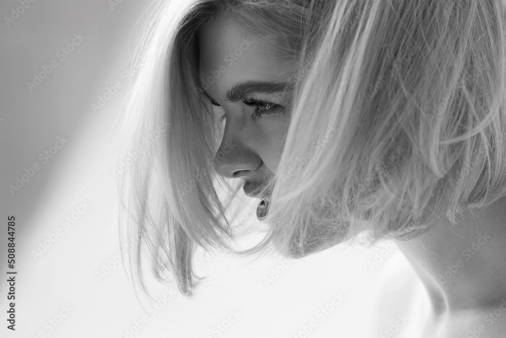 Hair and lips sensually cover the face of a blonde woman, short haircut, close-up, sexy, white background, black and white