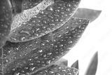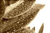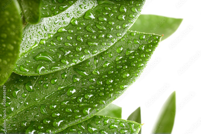 Green leaf with water drop on white. Nature horizontal background.