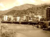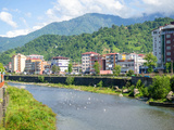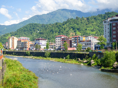 Beautiful quiet Turkish city on the banks of the river. Urban landscape. Quiet mountain place.