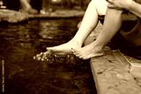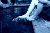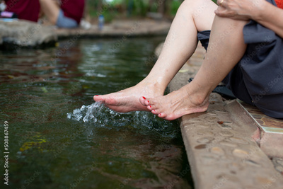 A happy asian young woman relaxing in a hot spring and using her foot to bail out the water.