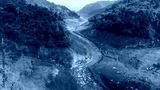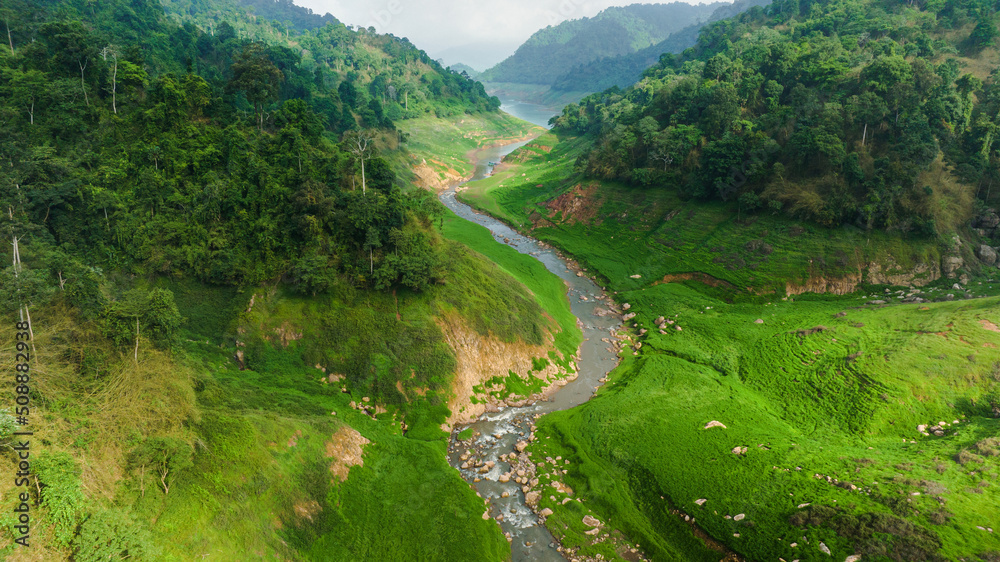 Aerial view of beautiful natural water stream and green field of grass in the wild forest mountain concept traveling and relaxing on holiday time.