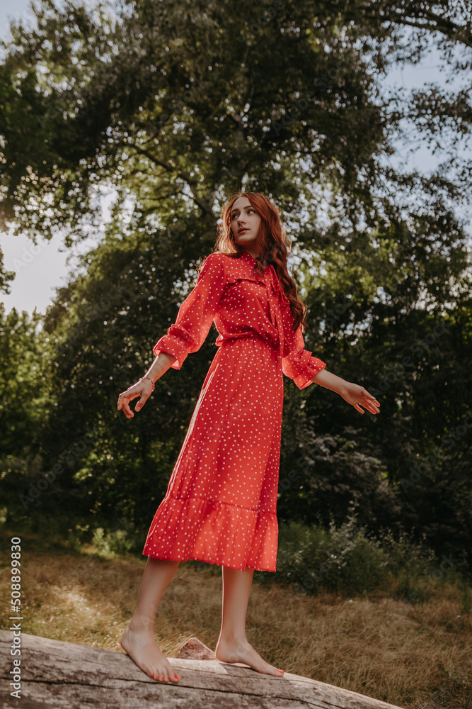 Redhead young woman in red summer country dress standing and balancing on a dry fallen tree in the middle of forest