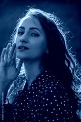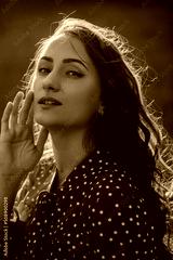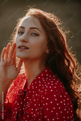 Portait of beauty young redhead woman with long curly thick hair dressed in red shirt dress with white dots posing on a camera in sunlight