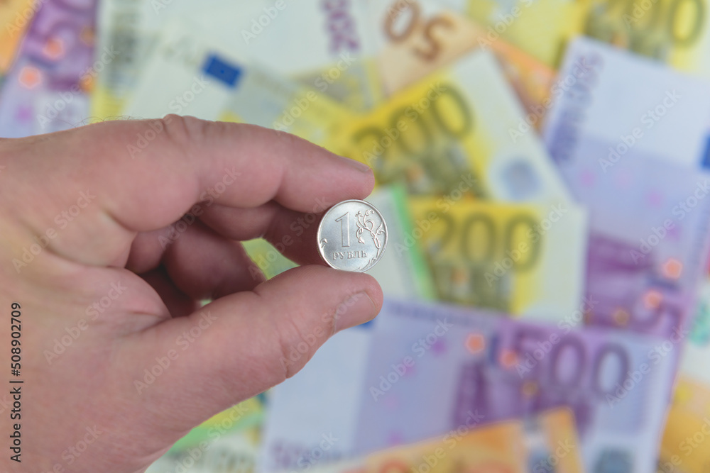 Ruble exchange. One ruble in hand at background of Euro banknotes. Close up