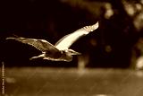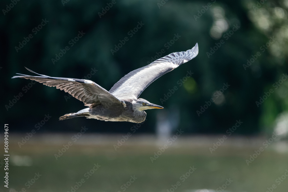 Beautiful image of Grey Heron Ardea Cinerea bird in flight during sunny Spring morning