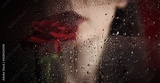 Red rose and lips with red lipstick. Glass with drops of water. Love and separation. Longing for a lover. Psychology of addiction