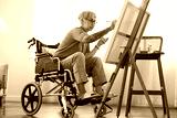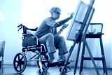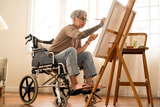 old senior asian female tattoo using art therapy while his legs is injured at home,asian elder woman spend recovering of her leg is getting better with painting canvas art in living room at home