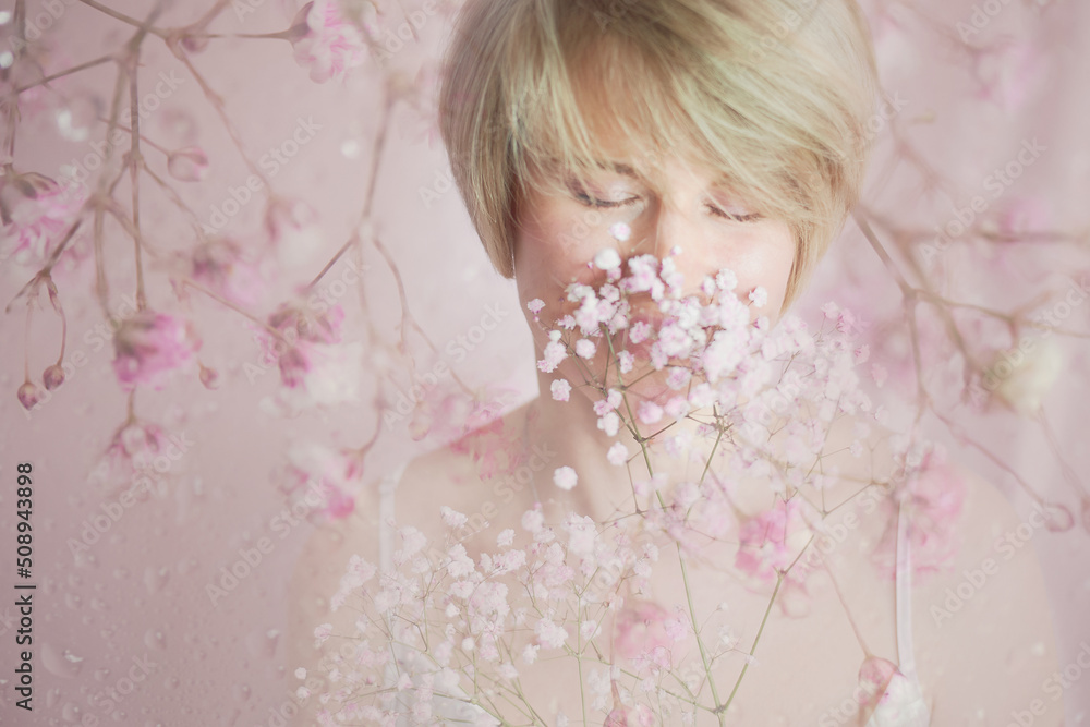 Portrait of a girl on a pink background with flowers. Tenderness and feminine. The sphere of beauty and women's health. Short haircut, blonde hair
