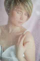 Portrait of a girl on a pink background with flowers. Tenderness and feminine. The sphere of beauty and women's health. Short haircut, blonde hair