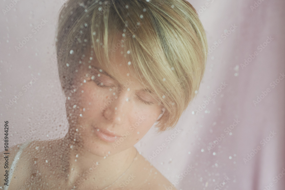 Portrait of a girl on a pink background with flowers. Tenderness and feminine. The sphere of beauty and women's health. Short haircut, blonde hair