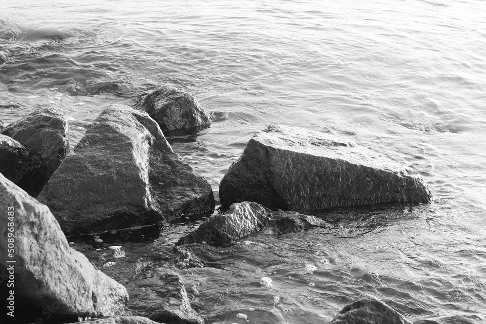 Black and white photo with beautiful wet stones on black and white background in style of old black and white retro photo as sample of black and white photo