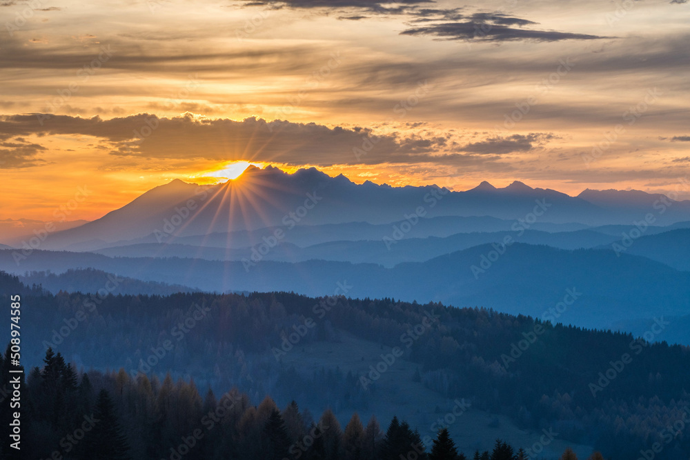Zachód słońca nad Tatrami widziany z Bacówki nad Wierchomlą,Beskid Sądecki.