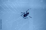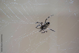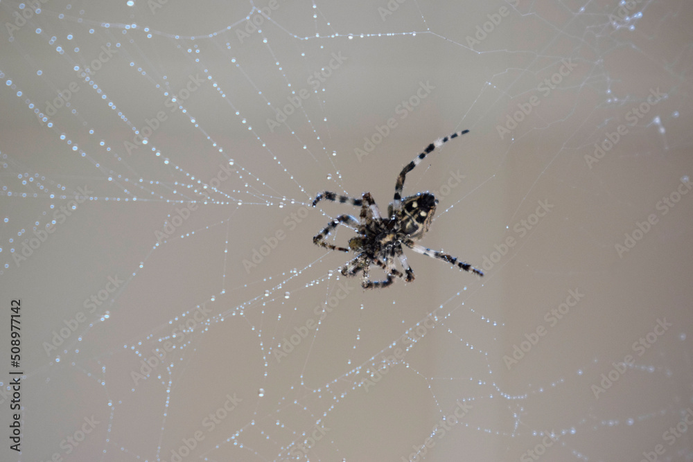 Garden black and white spider on a cobweb. Lots of little drops on a cobweb with a spider.