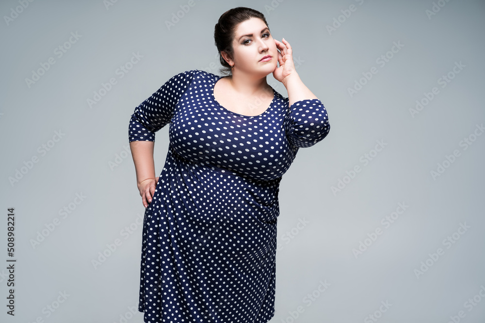 Plus size fashion model in blue polka dot dress, fat woman on gray background, body positive concept