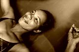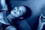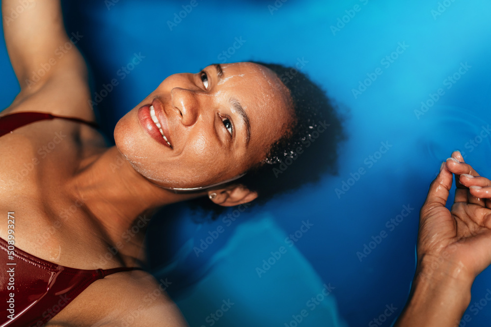 Beautiful middle-aged African American woman floating in tank filled with dense salt water used in meditation, therapy and alternative medicine.