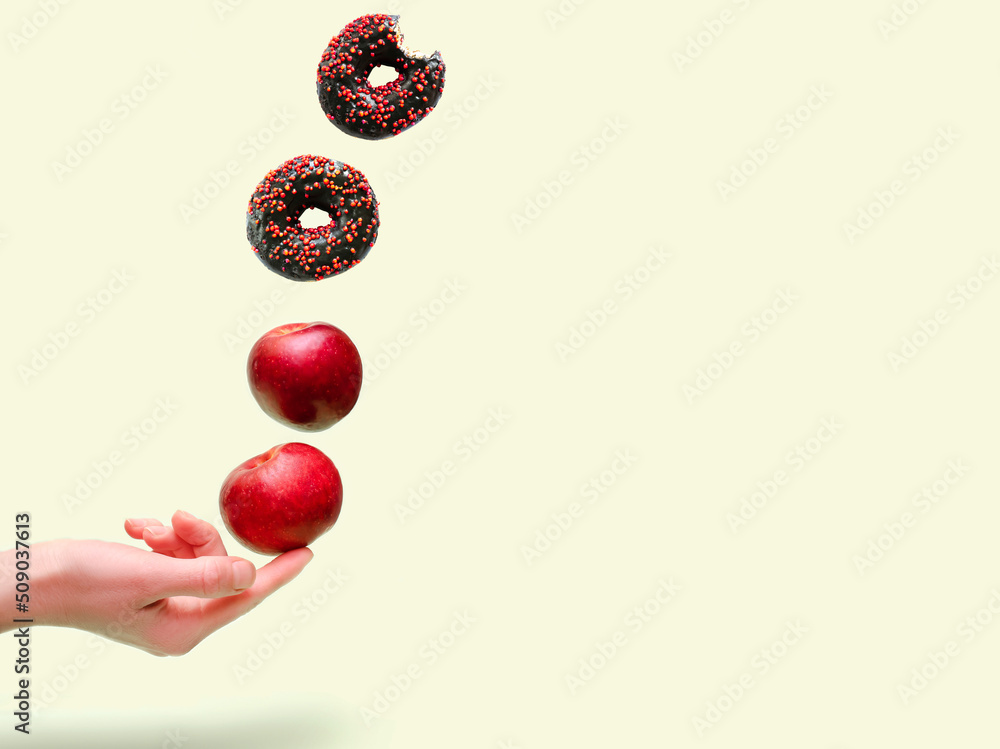 Flying levitating floating red ripe fresh apples with sweet glazed doughnut,donut in air above womens hand on green background.Creative fruits,dessert.Trendy, minimal food,healthy unhealthy nutrition