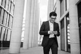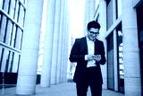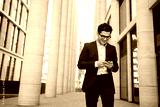 Uses a phone from a businessman a man in a business suit goes to work in the office