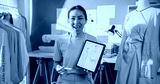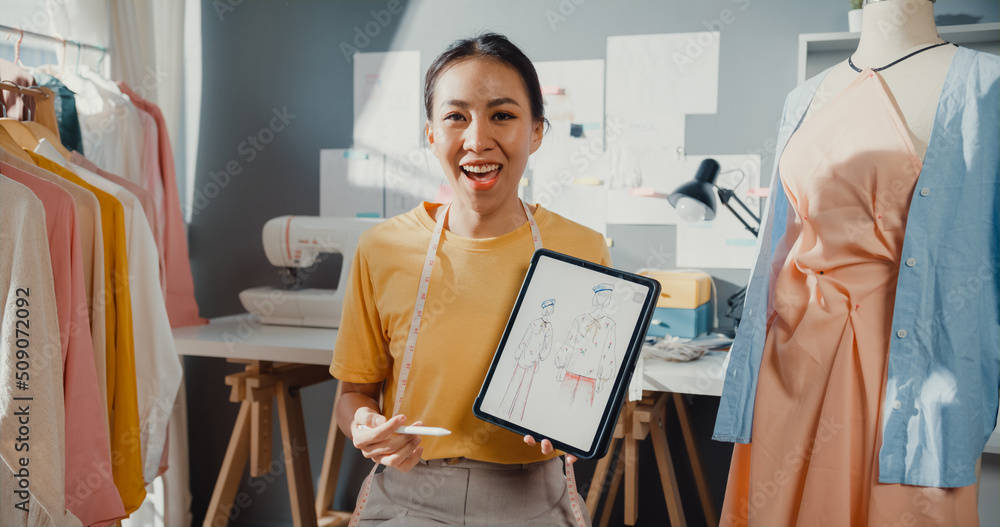 Young Asia lady dressmaker with casual hold digital tablet on meeting with graphic designer sketch discuss sample create dress design collection on desk in shop. Tailor new business startup concept.
