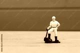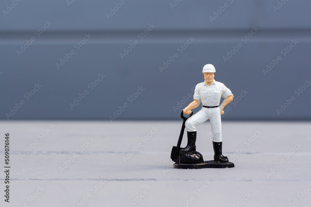 A toy man stands on a gray background. Man with a shovel. Background for advertising or poster.