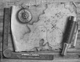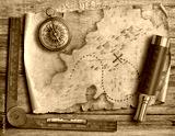 Old torn treasure map with compass and spyglass top view still life. Adventure and travel concept.