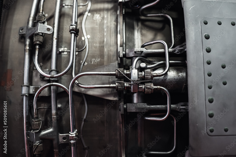 Aluminum surface of the aircraft fuselage. Sheet metal riveted. Aircraft skin close up. Rivets on gray metal.