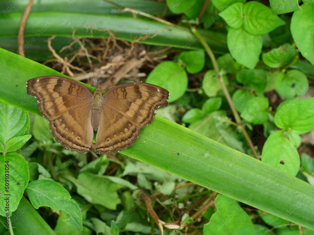The Chocolate Pansy ( Junonia iphita ) butterfly on leaf with natural green background, Brown stripe on the spreading wings of a tropical insect, Thailand