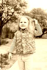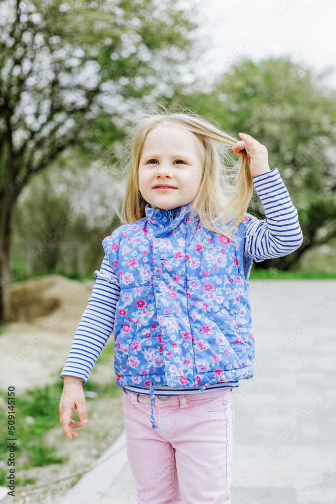 Cute little blonde toddler girl is playing in park. Concept of childhood and lifestyle. Spring