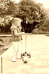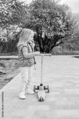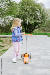 Little toddler girl learns to ride kick scooter in city park on spring day.