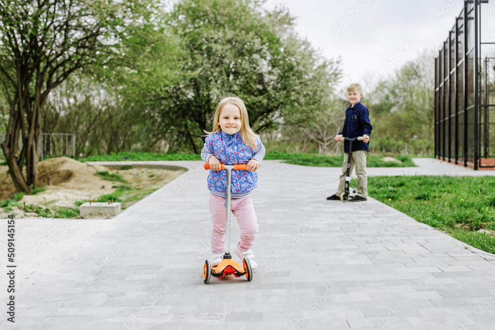Little toddler girl learns to ride kick scooter in city park on spring day.