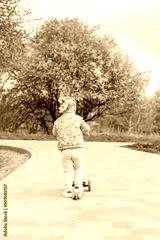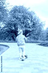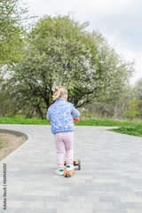 Little toddler girl learns to ride kick scooter in city park on spring day.