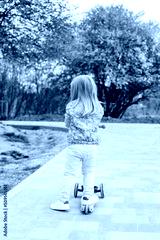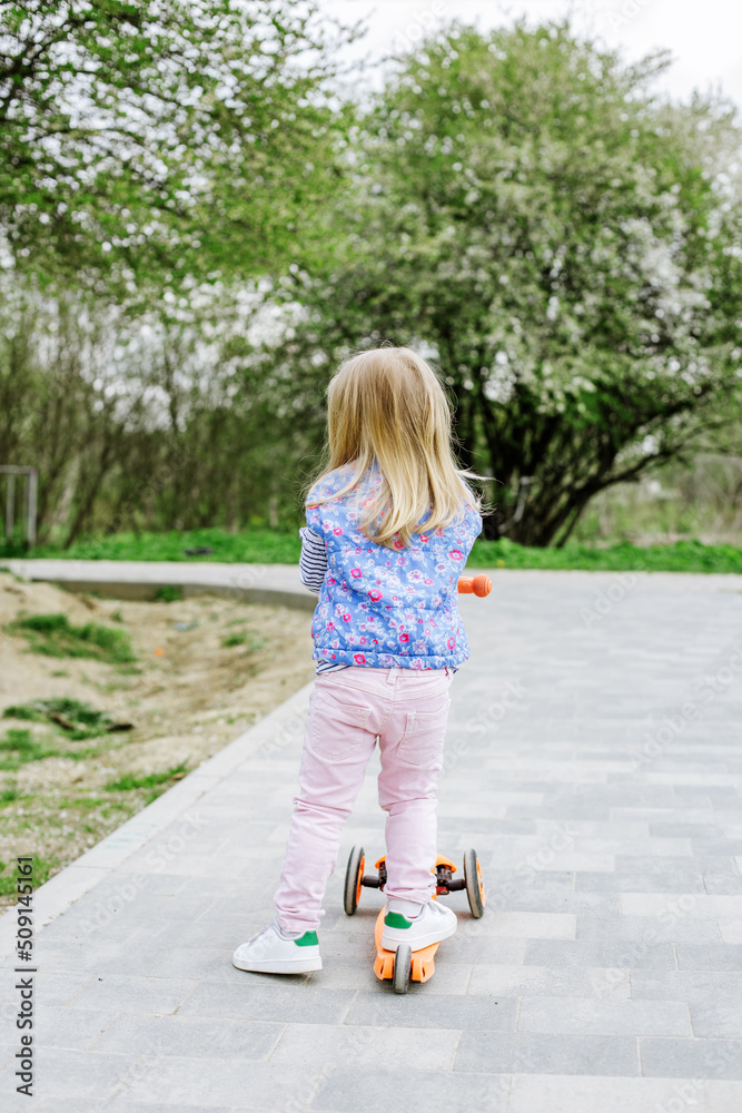 Little toddler girl learns to ride kick scooter in city park on spring day.