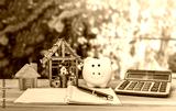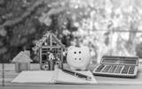 House placed on table. pen with notebook Coins and piggy banks on the table. concept planning savings money of coins to buy a home for property, mortgage and real estate investment, savings to a house