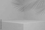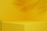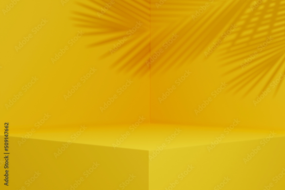 Yellow background studio interior room with tropical palm shadow. Minimal summer product stage platform mockup design. 3d render of square empty space with plant shade for product placement.