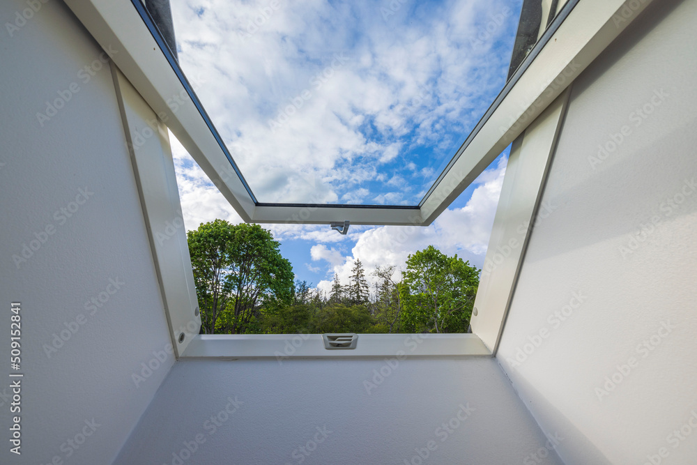 View from dormer roof window in house to tops of forest trees against background of blue sky with white clouds. Sweden.
