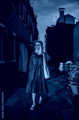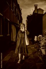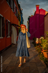 Happy smiling fashionable woman wearing trendy color sunglasses, hat, frill midi dress, orange sneakers, with big leather hobo bag, walking in street of Burano island, Italy. Full-length portrait