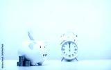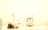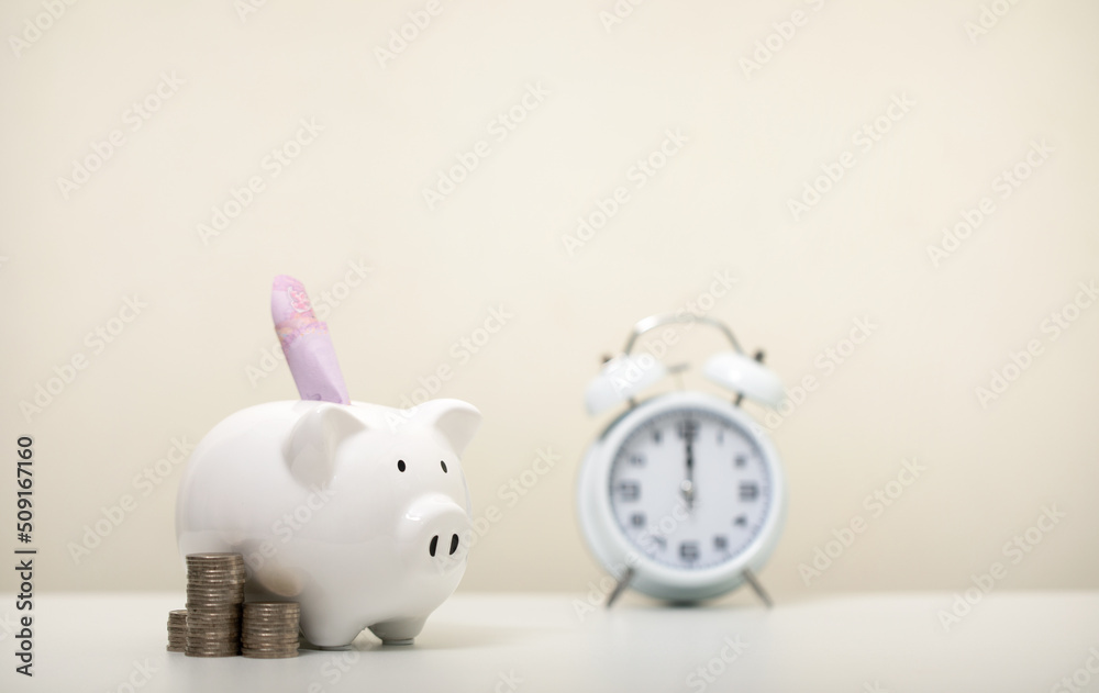 Banknotes are wearing white piggy banks and a pile of coins and an alarm clock on a white table, business, investment, finance, and money savings for future concepts