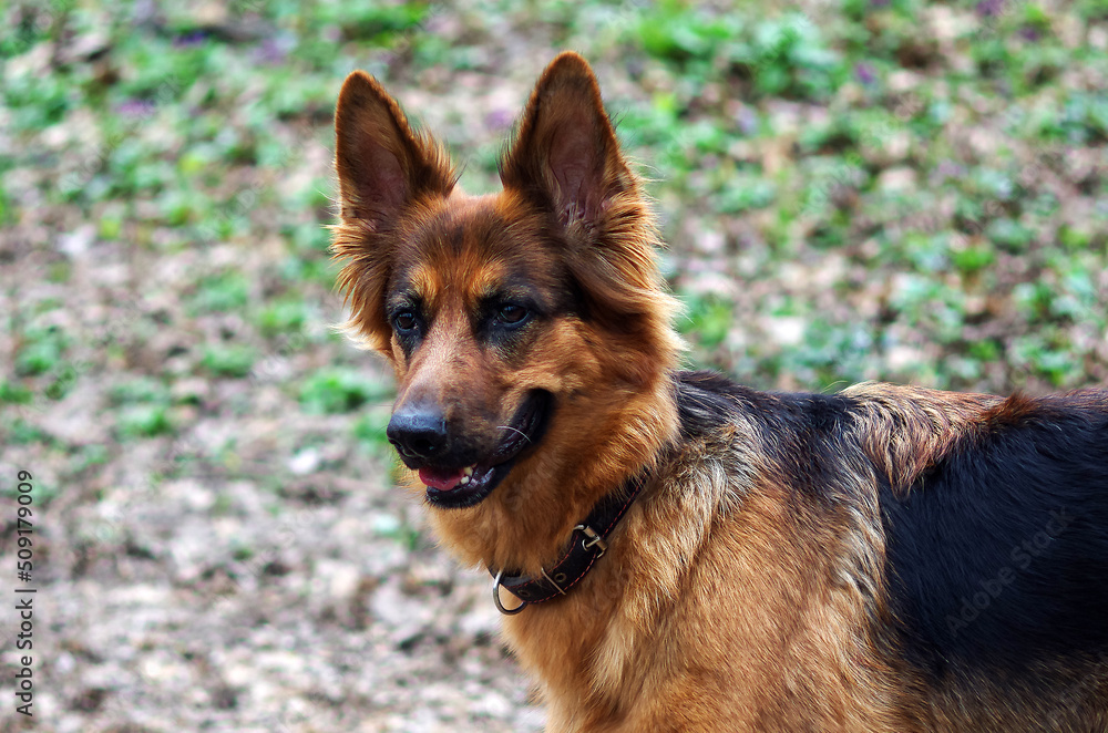 Portrait of a German shepherd walking in the park in the park. Purebred dog. German shepherd looking forward outdoors