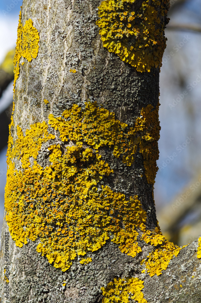The bark of an old tree with yellow spring lichen. Yellow moss on a tree branch