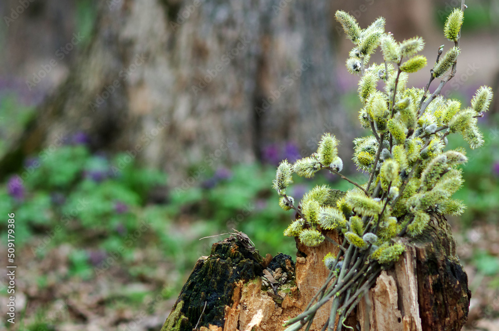 Easter or spring background with blossoming willow branches on a forest background. Willow branches on a stump.