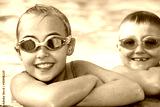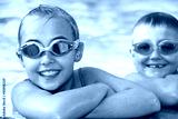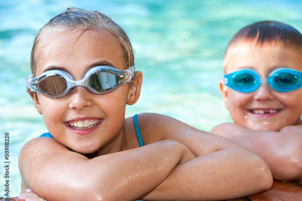 Kids in swimming pool with goggles.