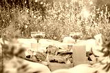 Aesthetic summer sunny lunch picnic with baguette, flowers, cocktail and berries at pale beige blanket at grass outdoor background with sunbeam. Front view.