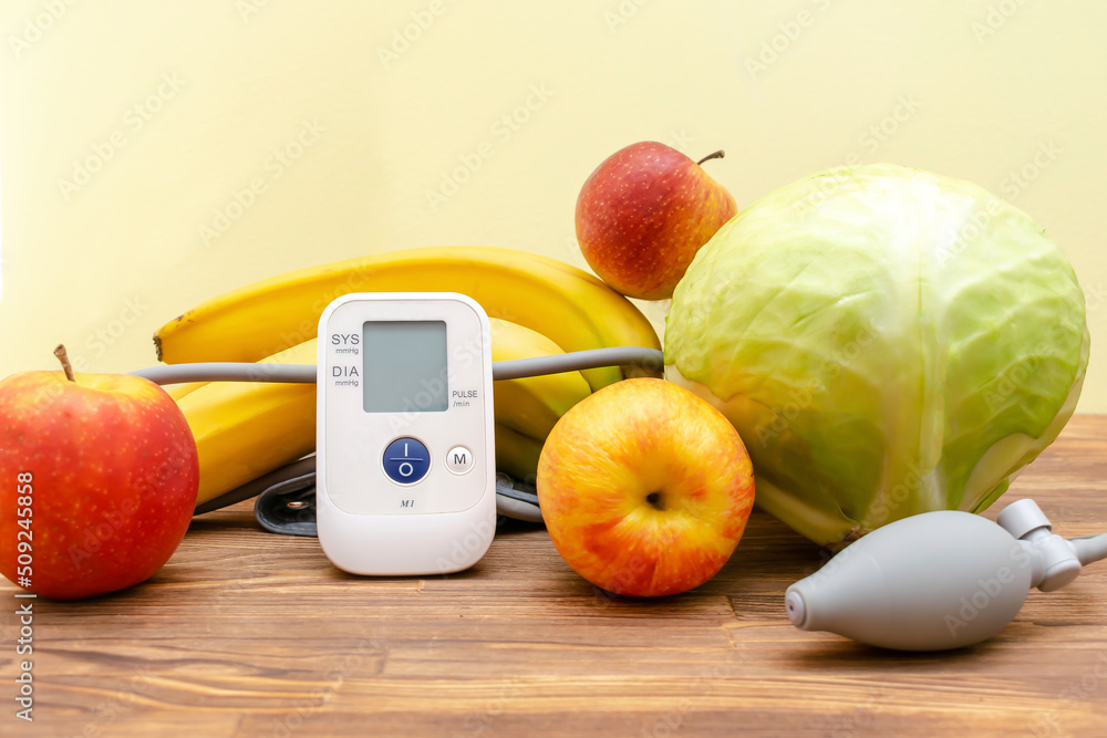 Tonometer and glucose meter,bunch of fresh vegetables,fruits, proper nutrition, healthy lifestyle, lowering blood sugar, heart pressure, diabetes concept on yellow,wooden background