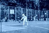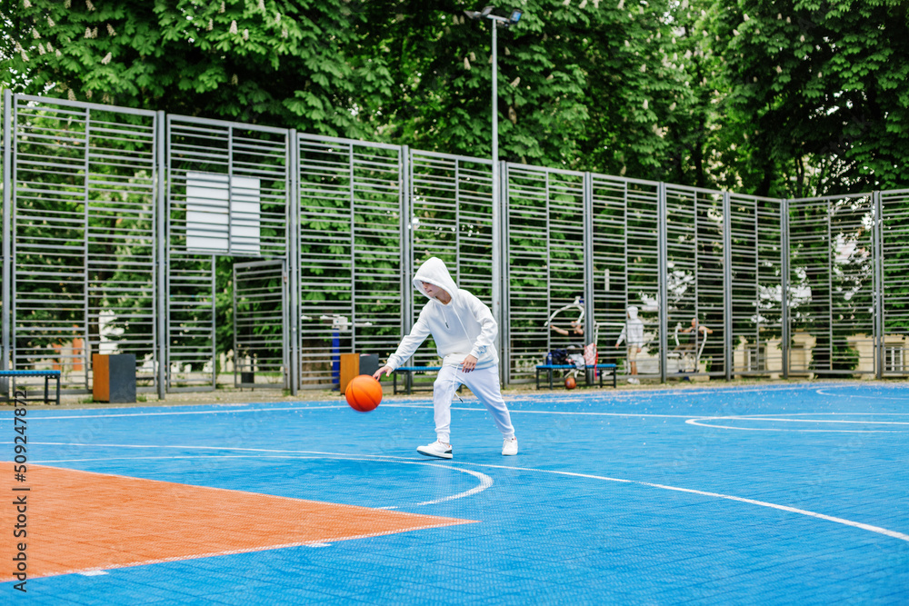 Teenage boy plays basketball on basketball court outside near school. White tracksuit.