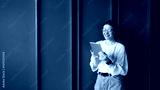 Writes a message in a chat a woman with glasses works uses a tablet in an office in a coworking space