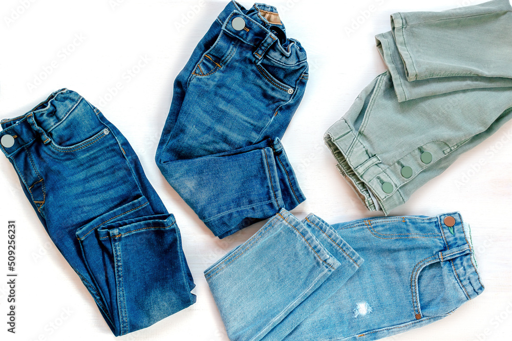 Childrens blue green trousers and jeans.Set of baby children's clothes and accessories for spring, autumn or summer on white background. Fashion kids outfit. Flat lay, top view, overhead,mockup