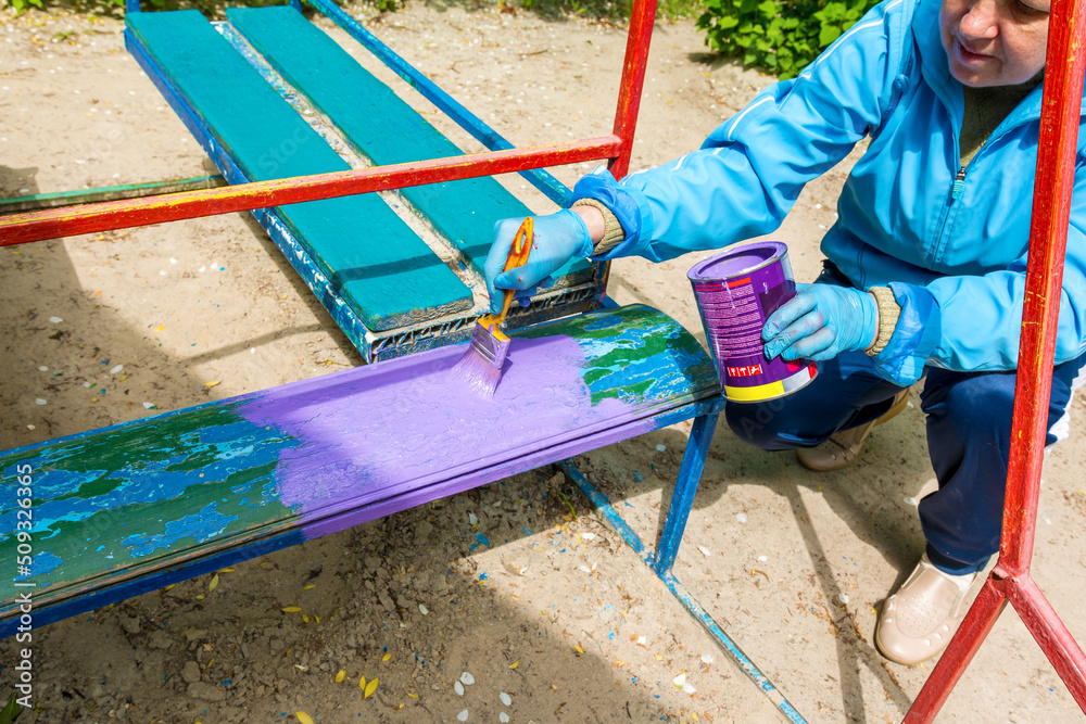 A woman paints a bench on the playground in kindergarten