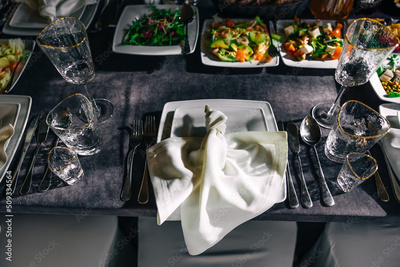 a beautifully set table, with glasses and cutlery, and various snacks.
